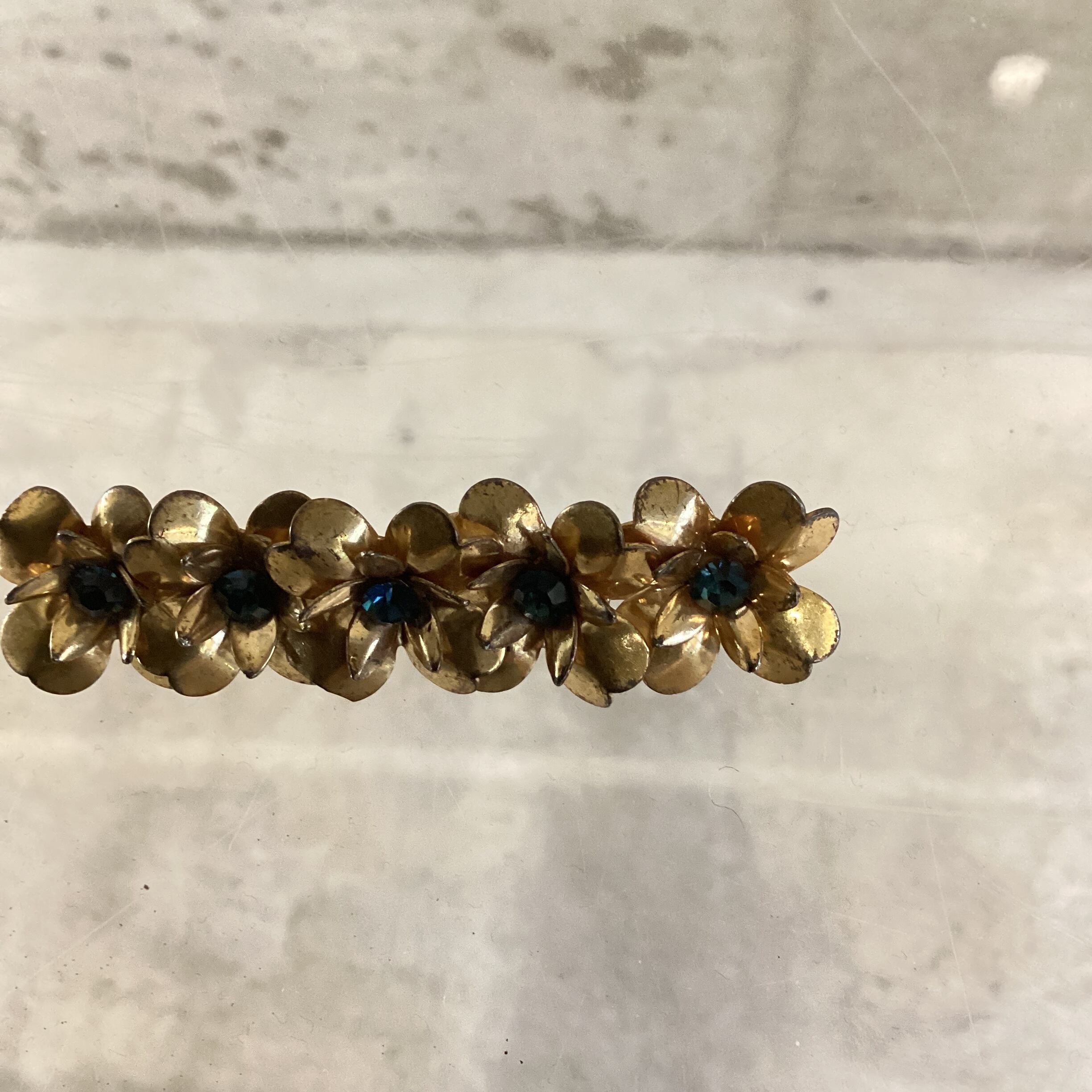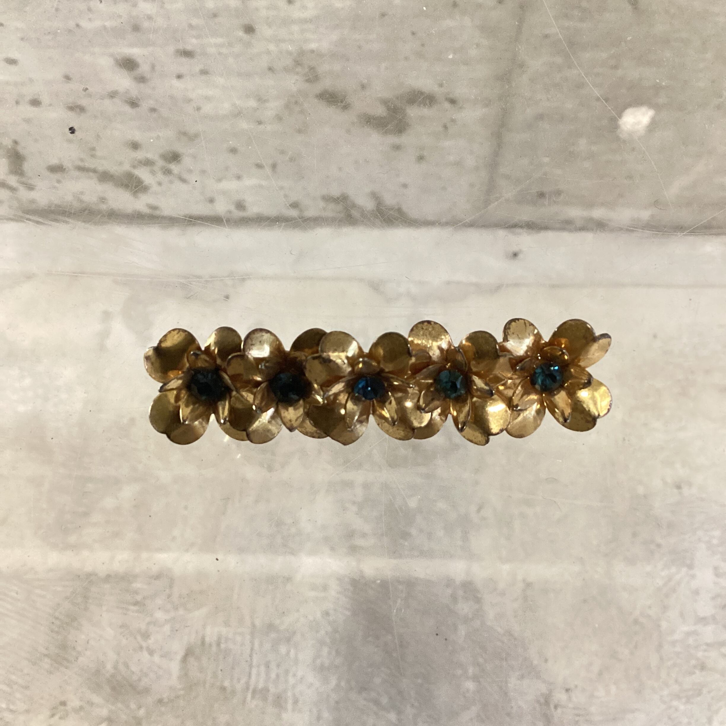 アンティークゴールドに薄めのブルーのストーンが儚げで美しいブローチです