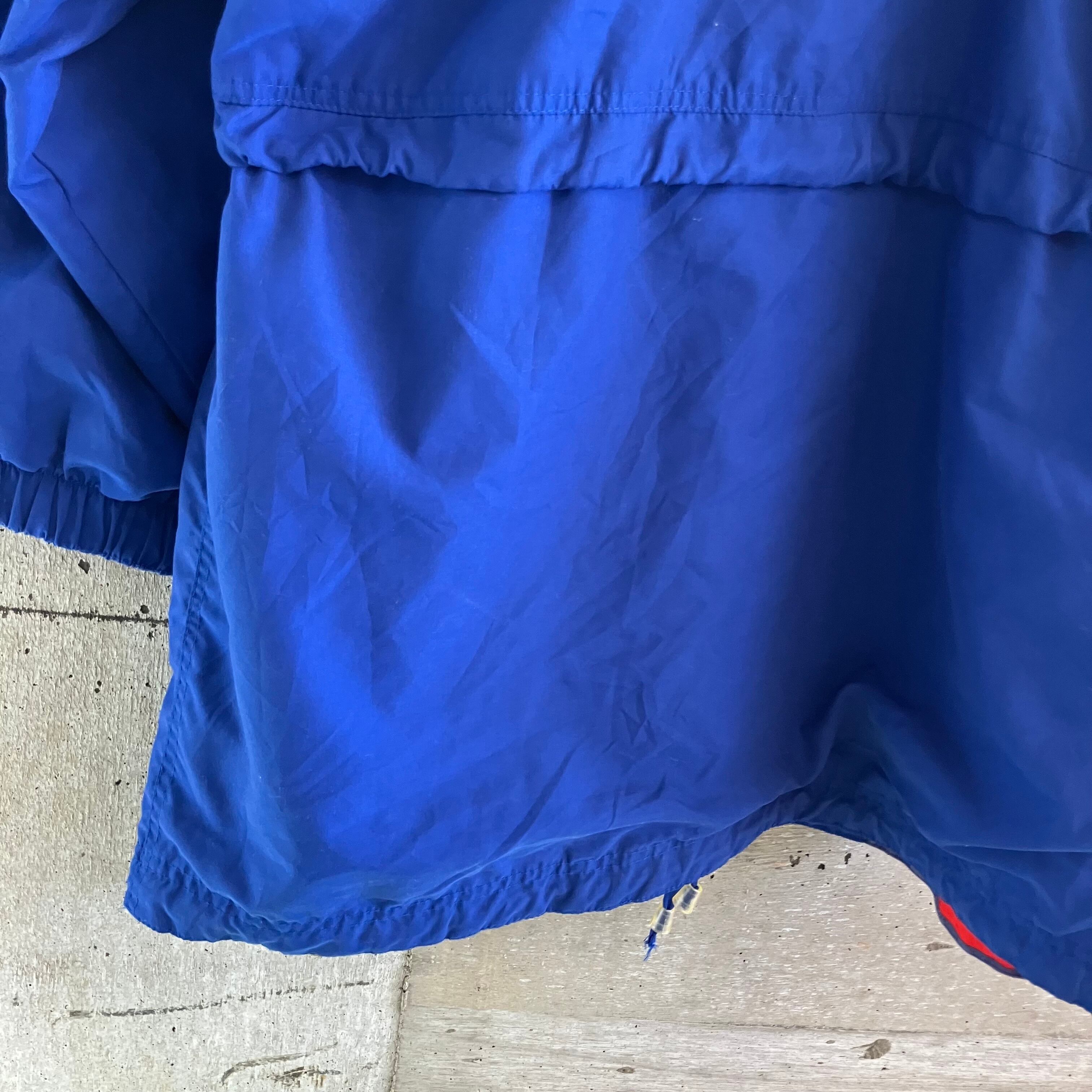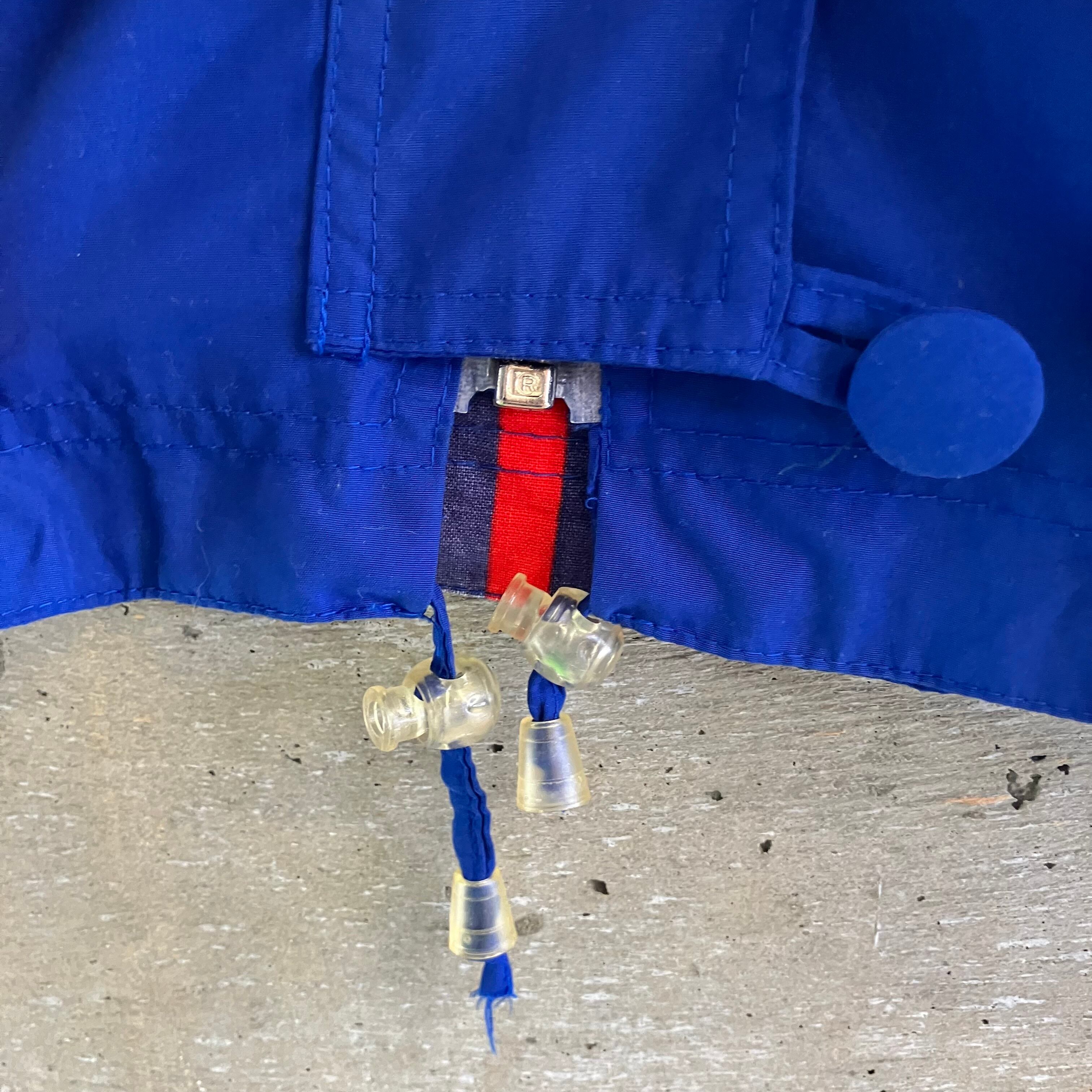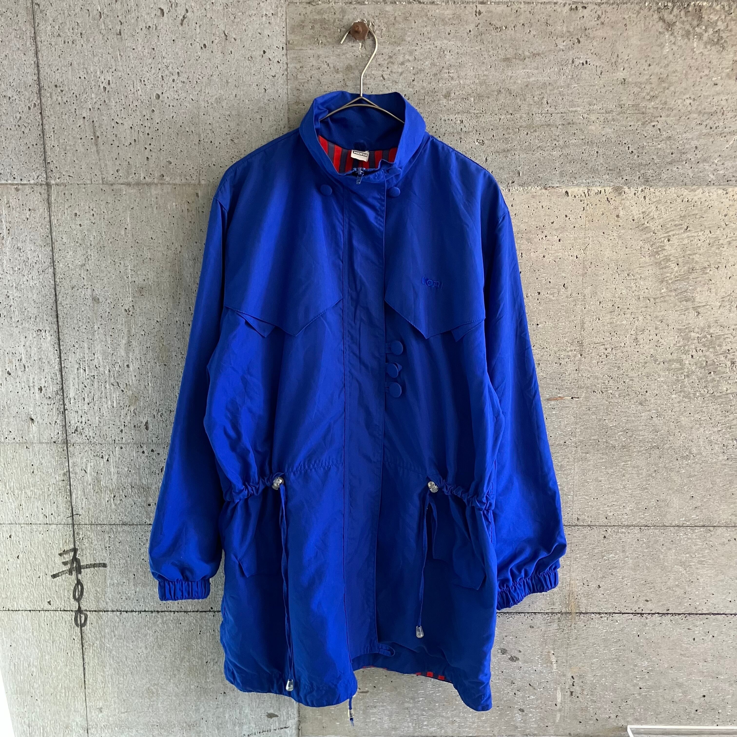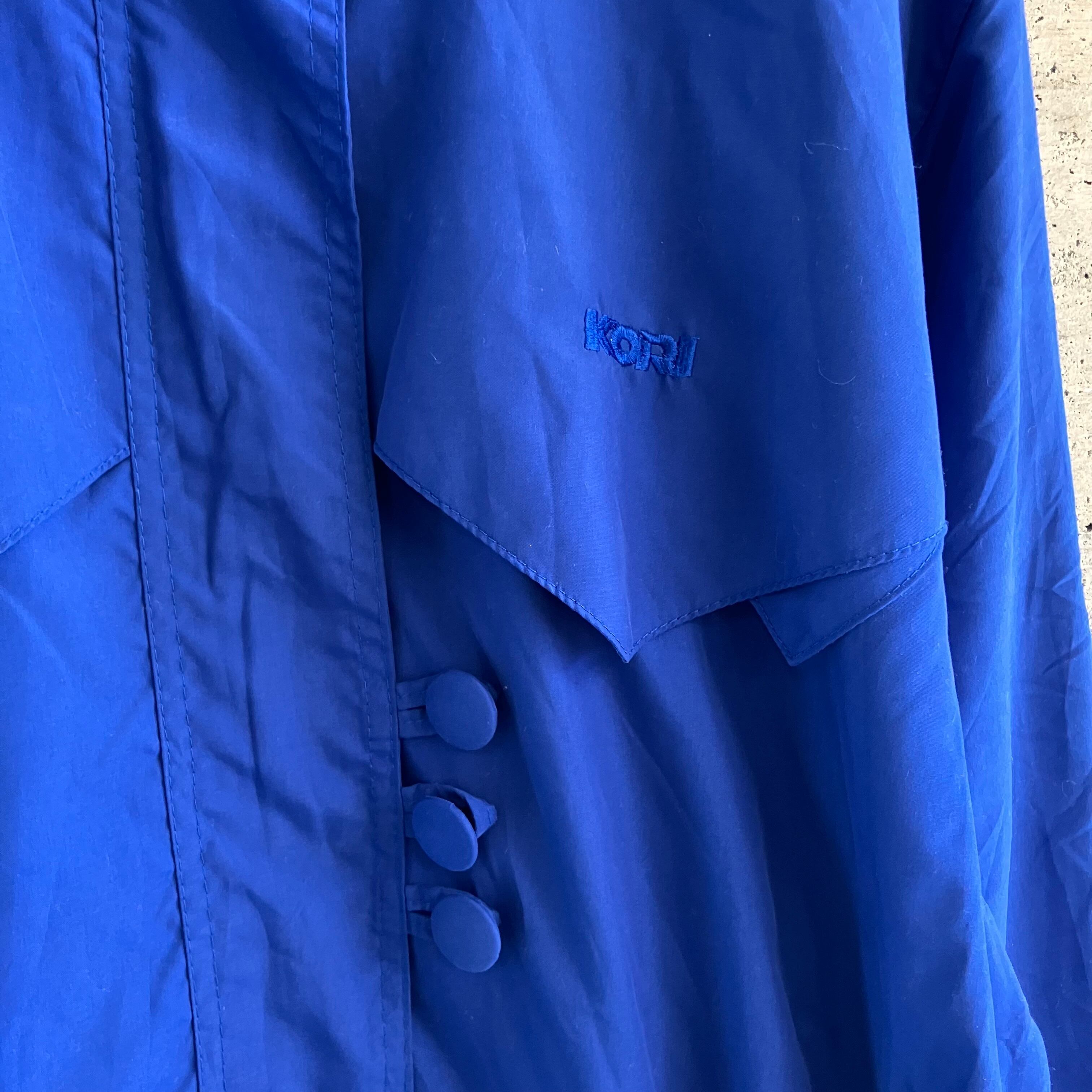 ドローコードが腰と裾に付けられた少し深めの青のコート。